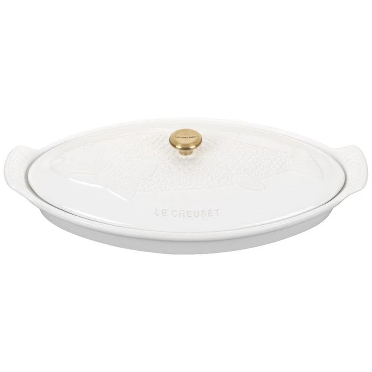 The Fish Baker features a covered oval baking dish embossed with an elegant fish motif and brushed gold knob. A striking presentation from oven to table, it’s perfect not only for baking, roasting, steaming, and broiling all manner of fish recipes – but also for roasting and steaming vegetables and meat, bubbling casseroles, one-dish meals and more. The ridges on the bottom of the baking dish keep food elevated for even cooking and browning, while the stoneware lid locks in moisture and keeps fish odors contained. Crafted from the finest quality stoneware to ensure food is cooked to perfection, the dish features a colorful glaze that is virtually nonstick for easy cleanup.