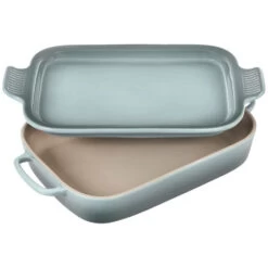 Le Creuset stoneware casseroles offer superior, highly functional performance in the oven and at the table. These durable stoneware dishes include tight-fitting lids and easy-to-grip grooved side handles, and are designed for a multitude of kitchen tasks, whether baking desserts, oven-roasting meats, broiling fish, or simply marinating before cooking.
