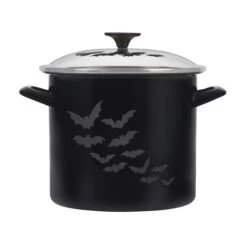 The Bat Stockpot features a cauldron of appliqué bats flying over the black onyx sides and glass top of the pot. With tall straight sides, it’s ideal for spooky soups, stocks, mulled cider and other harvest season treats. Crafted from lightweight, premium carbon steel, it delivers our fastest-heating performance to rapidly bring water to a boil. The easy to clean and durable colorful porcelain enamel coating is non-reactive and resistant to stains and flavors, making enamel on steel stockpots ideal for use year-round.