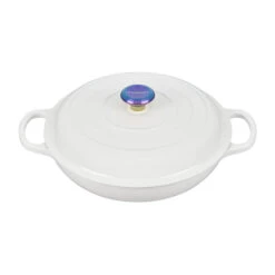 Add a kaleidoscope of color to your kitchen with the Iridescent Knob Le Creuset Braiser. Our Braiser is uniquely designed to provide steady, even heat to transform tough cuts of meat and hearty vegetables into tender, flavorful dishesThe wide base allows ingredients to be placed in a single layer for searing without crowding; once liquid is added, the domed lid circulates steam to lock in moisture and flavor. The versatile shape of the braiser also makes it perfect for shallow frying, steaming, stews, casseroles and serving at the table.