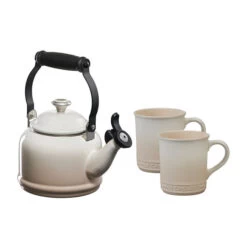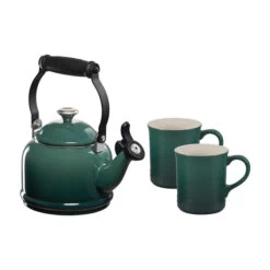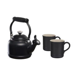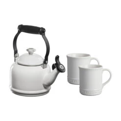 The Demi Kettle and Mug Set pairs our petite enamel on steel kettle with a charming set of matching stoneware mugs. The kettle is crafted from fast-heating premium carbon steel to rapidly bring water to a boil, and a fixed single-tone whistle alerts when the water is ready. Serve your favorite beverage in the perfectly color coordinated mugs – the generous 14-ounce capacity keeps contents warm or cold and is finished with a vibrant glaze which is easy to clean, dishwasher-safe, and resistant to chips, scratches and stains. The beautiful set makes an excellent gift for weddings, showers, parents, or any tea or coffee lover.Â