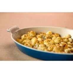 For recipes that call for a crisp topping, the Heritage stoneware oval au gratin dish provides a wide, shallow cooking area in a variety of sizes, exposing ingredients more directly to heat.