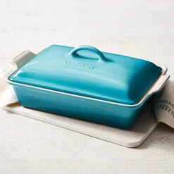 The Rectangular Casserole baking dish is perfect for indulgent desserts, comforting casseroles, marinating meats, broiling fish and more. Not only does the stoneware lid lock in moisture and heat while baking, but makes it easy to carry dishes to potlucks and picnics, or for storing leftovers. Crafted from premium stoneware to ensure food is cooked to perfection, the dishes feature a colorful glaze that is virtually nonstick for easy cleanup.Â