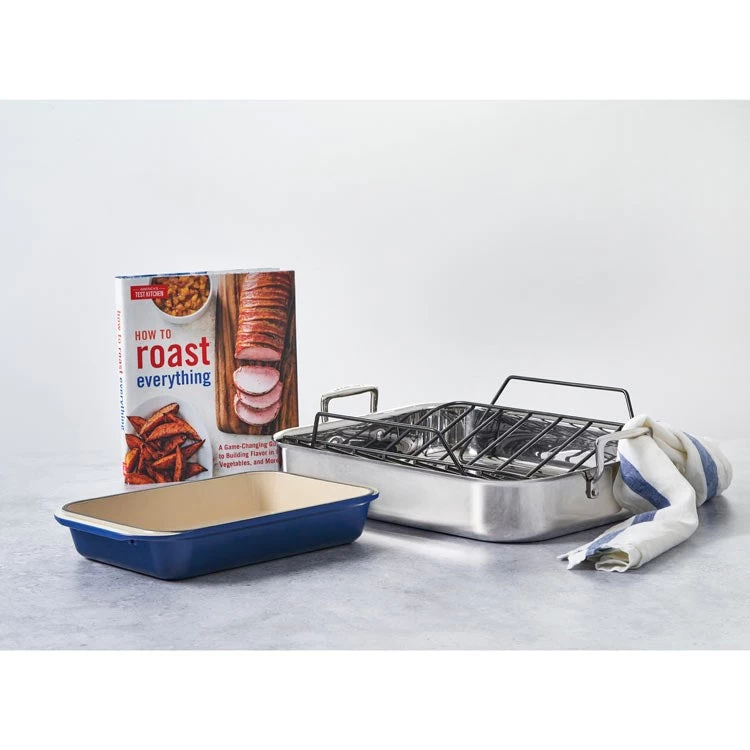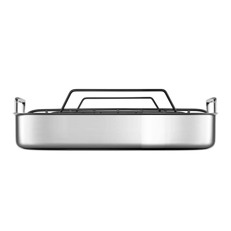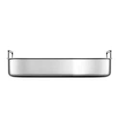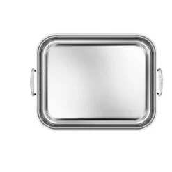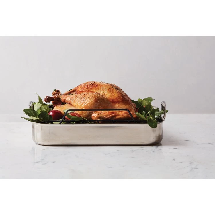 Roast meats and vegetables to perfection in this large stainless steel roasting pan. A precision-pour rim creates clean pouring and a nonstick rack elevates food for even cooking. Measures 13.25″ wide x 16.25″ long.