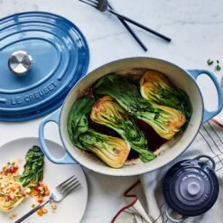 The iconic Le Creuset Dutch oven is indispensable in the kitchens of home cooks and professional chefs alike. Expertly crafted from enameled cast iron, the everyday versatility of the Dutch oven makes it ideal for everything from slow-cooking and braising to roasting, baking, frying and more. The oval shape is particularly suited for larger cuts of meat, whole chickens and for baking oval-shaped loaves of bread.