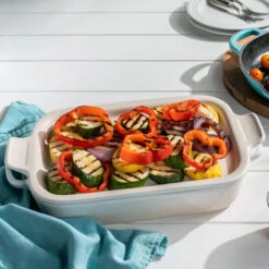 The Rectangular Dish with Platter Lid is designed for beauty and versatility from oven to table, and the two dishes can be used together or separately. Marinate meat or vegetables in the baking dish and then use the platter lid to serve after grilling or baking. Or use the baking dish on its own for everything from rich desserts to roasting vegetables, bubbling casseroles and more – the lid makes it easy to store leftovers. The platter lid is also an attractive serving piece for cheese, appetizers and salads. Crafted from premium stoneware to ensure food is cooked to perfection, the dishes feature a colorful glaze that is virtually nonstick for easy cleanup.