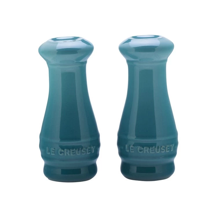 Whether kept on the table for use during meals or on the countertop for seasoning during cooking, the stoneware salt and pepper shakers make colorful accents during mealtime. Each holds three ounces of salt and pepper. Traditional Le Creuset rings and lettering give the set a decidedly classic feel.