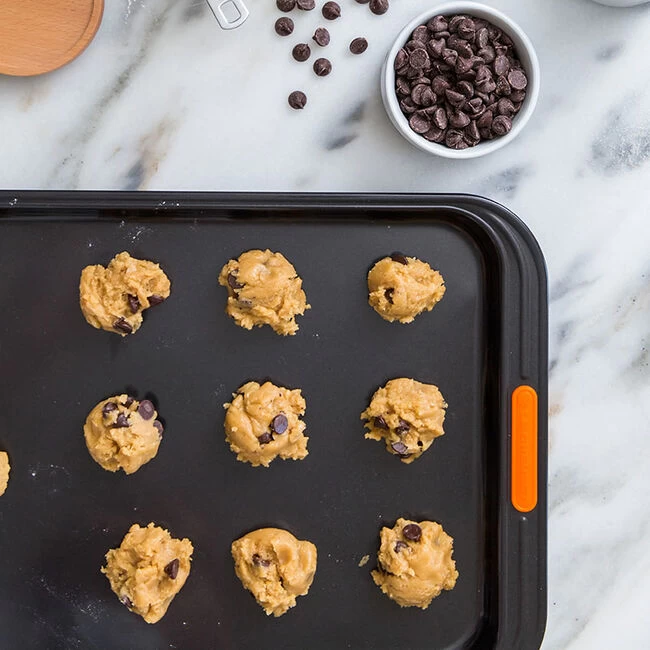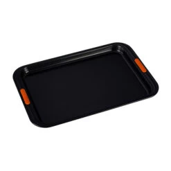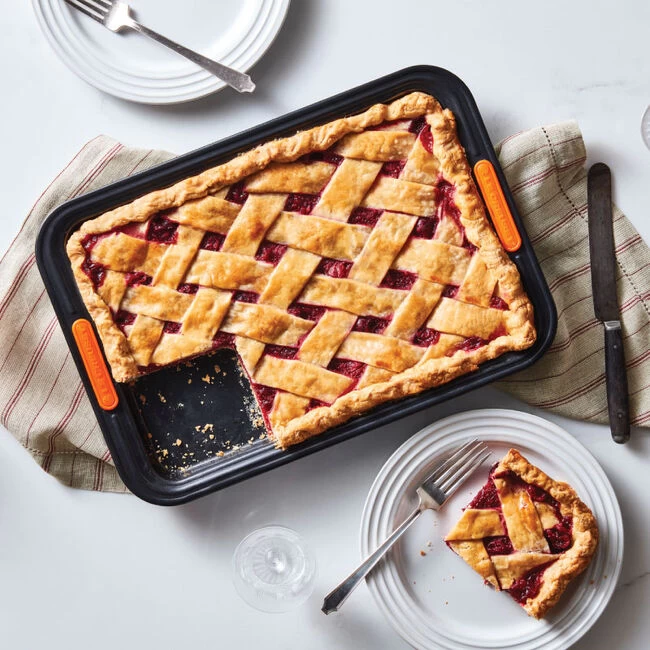 Not just for sheet cakes, the sheet pan is a kitchen essential for everything from baking cookies to roasting vegetables and making sheet pan meals. An innovative silicone coating ensures easy release and effortless cleanup, while the heavy-gauge carbon steel construction delivers superior heat conduction and even baking. Lightweight and durable, the wide rims with heat-resistant silicone grips makes it easy to transfer a full pan to and from a hot oven.