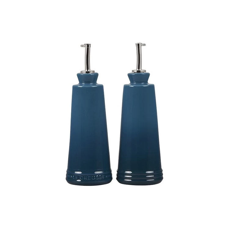 Whether prepping in the kitchen or serving at the table, the Oil and Vinegar cruets are designed to hold and serve all varieties of oils, vinegars and other liquids. Crafted from Le Creuset’s finest quality stoneware to protect oils from the damaging effects of light and heat, the contemporary design features a stainless steel nozzle for precise control when pouring. They’re finished with an impermeable glaze inside and out that is easy to clean and dishwasher safe, while the addition of the Le Creuset name on one of the bottles makes it easy to distinguish between the set of two.
