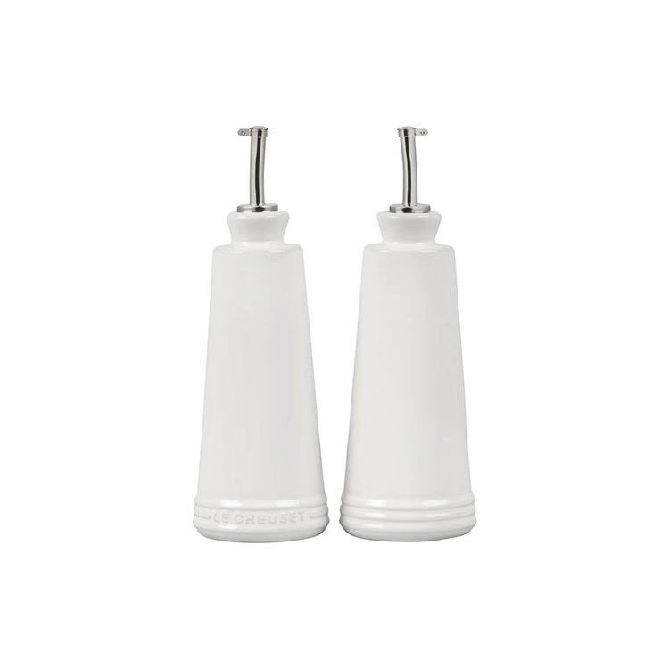 Whether prepping in the kitchen or serving at the table, the Oil and Vinegar cruets are designed to hold and serve all varieties of oils, vinegars and other liquids. Crafted from Le Creuset’s finest quality stoneware to protect oils from the damaging effects of light and heat, the contemporary design features a stainless steel nozzle for precise control when pouring. They’re finished with an impermeable glaze inside and out that is easy to clean and dishwasher safe, while the addition of the Le Creuset name on one of the bottles makes it easy to distinguish between the set of two.