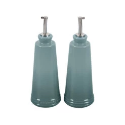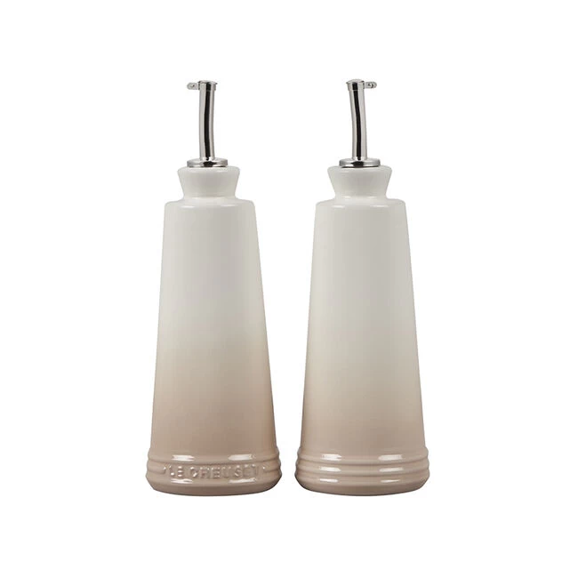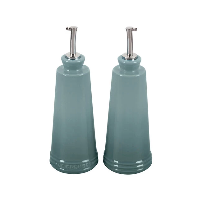 Whether prepping in the kitchen or serving at the table, the Oil and Vinegar cruets are designed to hold and serve all varieties of oils, vinegars and other liquids. Crafted from our finest quality stoneware to protect oils from the damaging effects of light and heat, the contemporary design features a stainless steel nozzle for precise control when pouring. They’re finished with an impermeable glaze inside and out that is easy to clean and dishwasher-safe, while the addition of the Le Creuset name on one of the bottles makes it easy to distinguish between the set of two.
