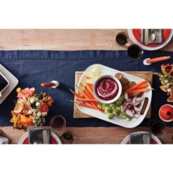 The stoneware serving platter features ridged edges that slope upward to contain food, while two wide handles are cut into each end to ensure a steady grip when carrying heavier foods like roasts or poultry to the table.