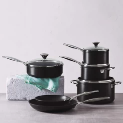 The 10-piece Nonstick cookware set features our best selling pots and pans, and includes the essentials for those starting out or outfitting a new home. Now 4x stronger, Le Creuset’s Toughened Nonstick PRO nonstick pans deliver superior results and everyday ease of use for everything from searing fish to sauteing vegetables and making omelets. Each exceptionally versatile pan features a textured triple-reinforced coating that is ideal for browning and searing, with or without oil, and easily wipes clean. Safe for dishwasher, oven and metal utensils, Le Creuset’s nonstick is the choice for mastering flavorful meals from stove to oven to table.