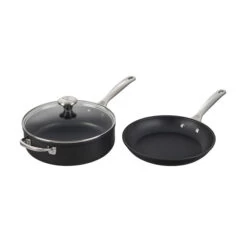 Set includes: 10″ Toughened Nonstick PRO fry pan and 4 1/4 qt. Toughened Nonstick PRO saute pan with glass lid.