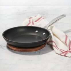 The Toughened Nonstick PRO Fry Pan delivers superior results and everyday ease of use for everything from searing fish to sautéing vegetables and making omelets. A versatile kitchen staple, it features a textured triple-reinforced nonstick coating that is ideal for browning and searing, with or without oil, and easily wipes clean. Bring the fry pan straight to the table for serving on the Magnetic Wooden Trivet. The beautiful 8-inch circular trivet instantly attaches to the bottom of metal cookware, and will protect surfaces from heat in handsfree effortless style. Together, the fry pan and trivet set is the choice for mastering flavorful meals from stove to oven to table.